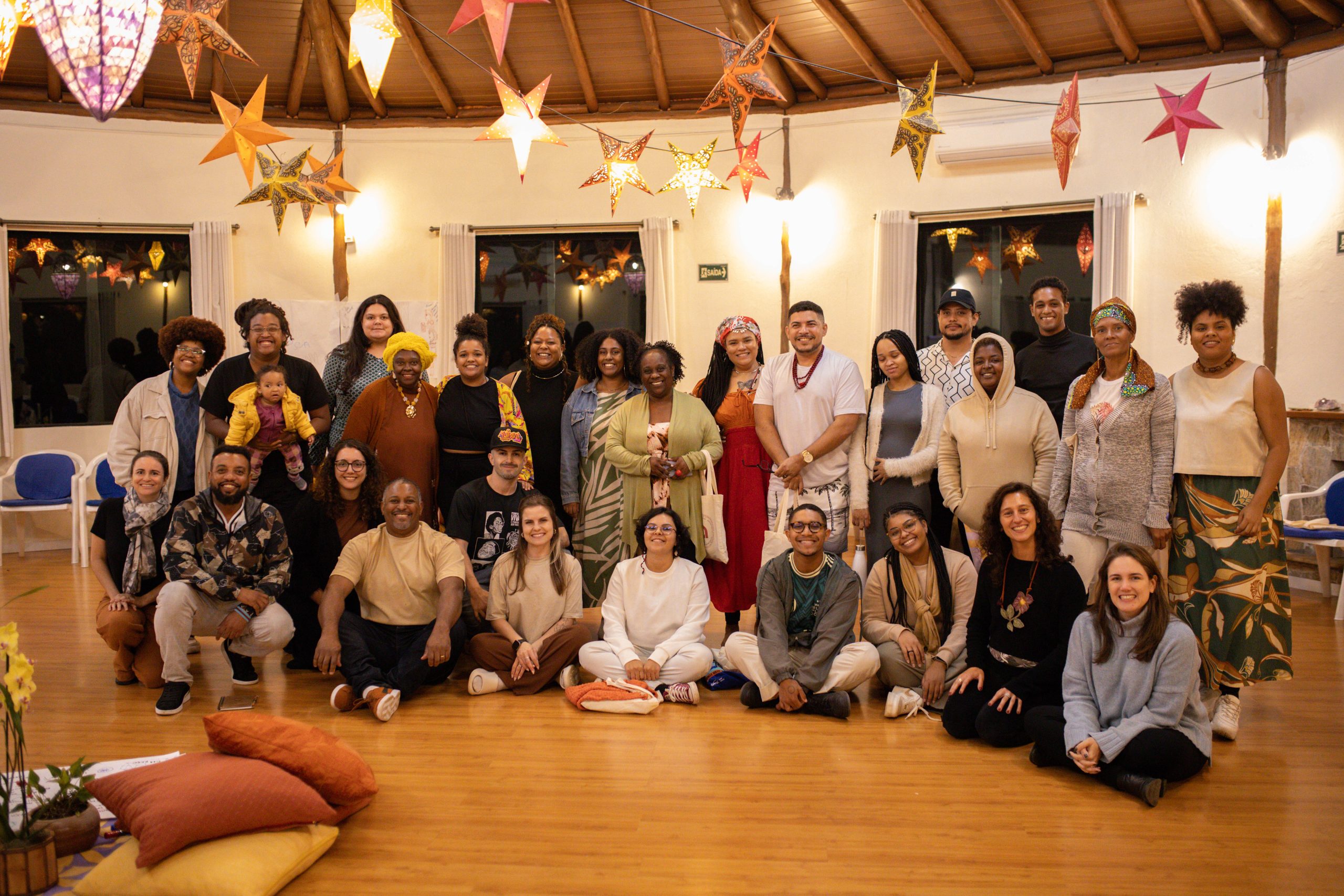 Participantes do Fundo POP em encontro de formação, reunidos em grupo em ambiente decorado com estrelas coloridas.